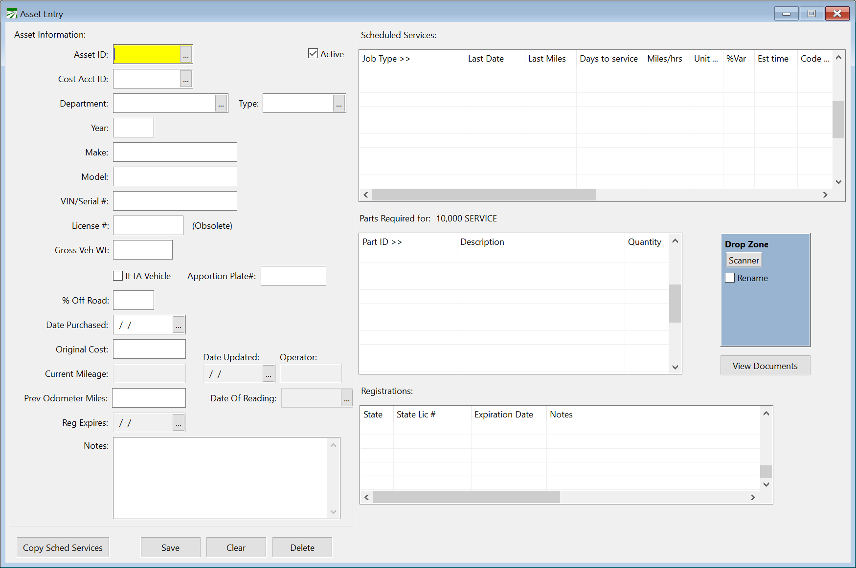 The Asset Entry file is where you will enter and maintain all of the specific information for each vehicle or piece of equipment and set up the scheduled services. The information maintained in this file includes the department using the vehicle, the year, make and model, VIN/Serial #, License number and expiration date, current mileage, scheduled services, and more. Information contained in this file is used throughout the program.