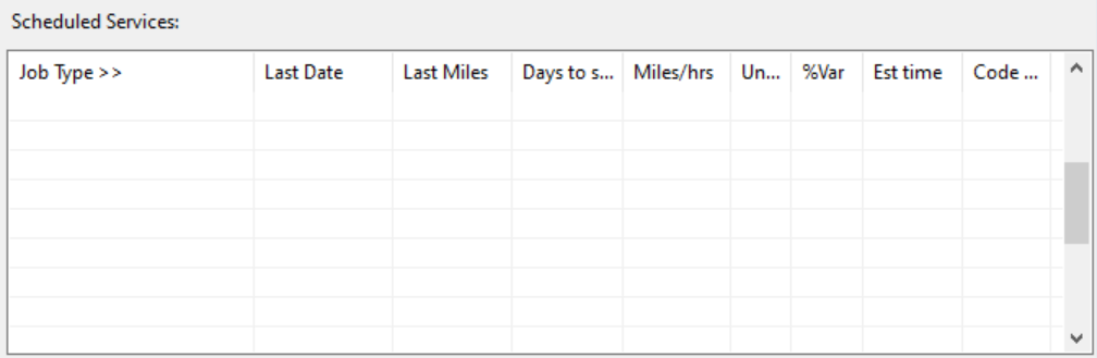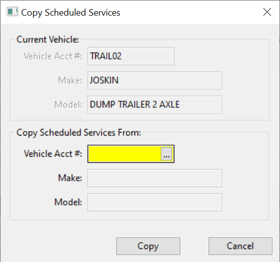 To save you time in entering scheduled services on like vehicles, the “Copy Sched Services” button will copy Scheduled Services and Parts Required from one vehicle that has already been set up to another vehicle.