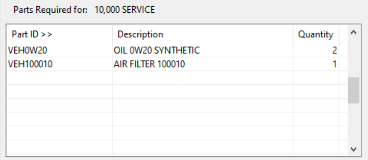 To enter parts required for a specific service, you must first click on that service under Scheduled Services. Note that the service name will then appear next to “Parts required for.” You may then start your entry of parts required. When you are finished with the parts entry for a particular service, you may select another service under Scheduled Services and enter the parts required for that service.