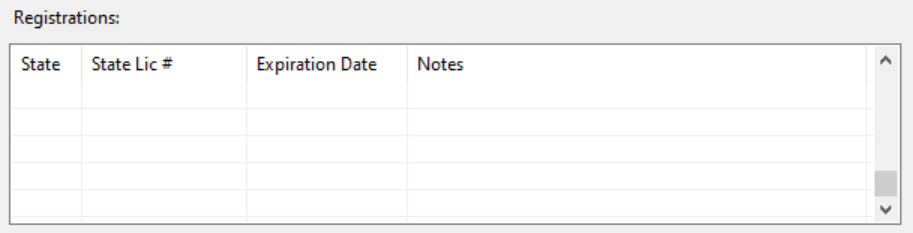 For each registration, enter the State, the State License # and Expiration Date. There is also room for an additional note.