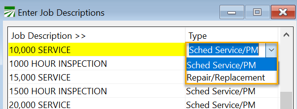 Go to File Maintenance > Asset Types. Set up the Job ID PM / G/L # PM (Scheduled Service) and the Job ID Rep / G/L# Rep (Repair/Replacement).