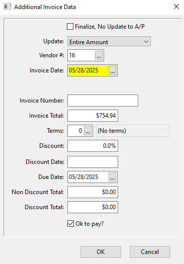Complete any other necessary information and click Ok. This will create your AP Invoice.