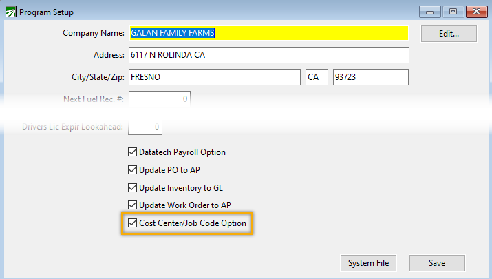 To enable this option, go to Tools > FarmFleet Program Setup. Then select Cost Center/Job Code Option.