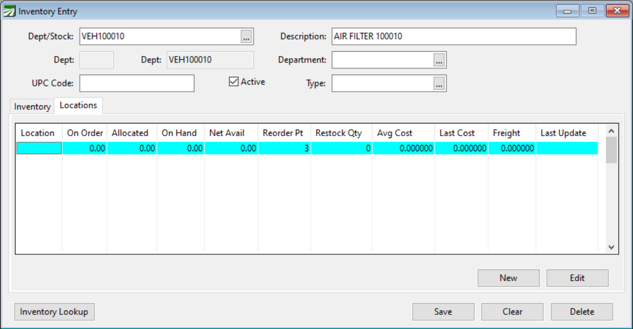 Note If you would like to use Departments, you must enable this first by going to Tools > FarmFleet Program Setup > Inv Dept Requiredand select Yes. This can only be enabled by Datatech Support. The first characters must be the one-, two- or three-character code set up for the department. Then you may enter up to 15 characters for the stock number.