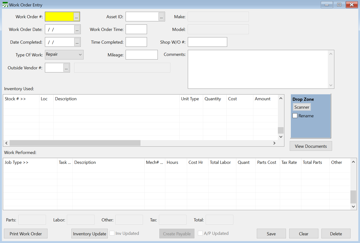 Use the Work Order Entry window to enter, edit, and print Work Orders. You can enter a Work Order to be completed or enter information on work already performed.