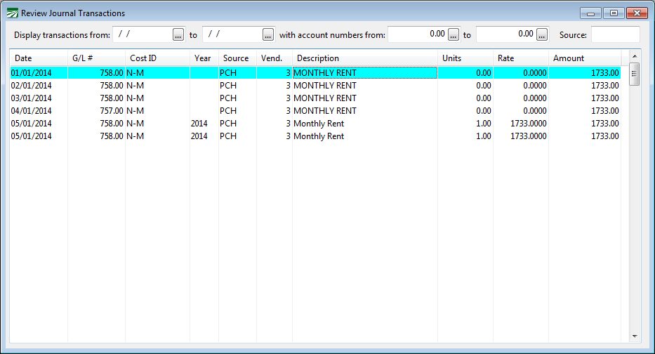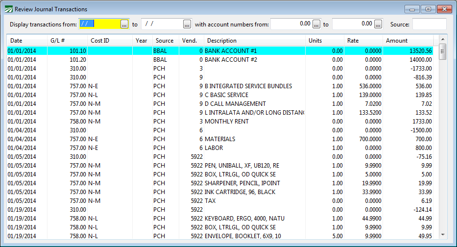 The Review Journal Transactions option can be used to view and edit some information on transactions in the General Ledger. You can also print a list of the transactions that are displayed in this window.