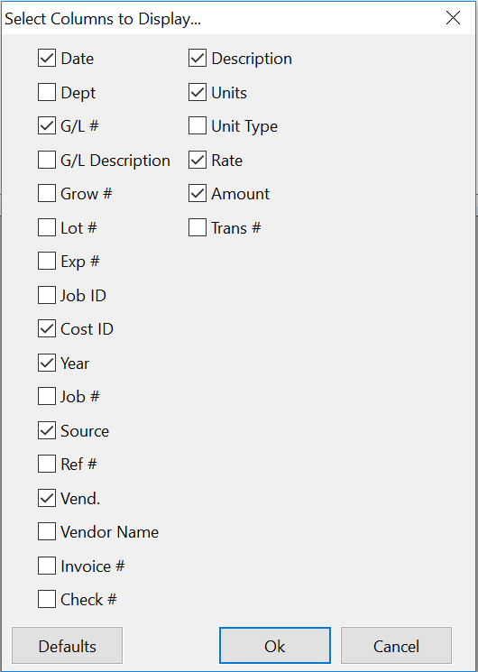 Select the box of any column that you want to see. Deselect the box of any column that you don't want to see. For example, if you are looking at vendor check transactions, you may want to enable the Check # column. To make room for it, you may want to deselect the Units and Rate columns.