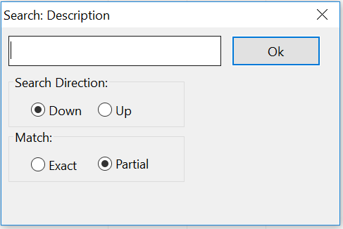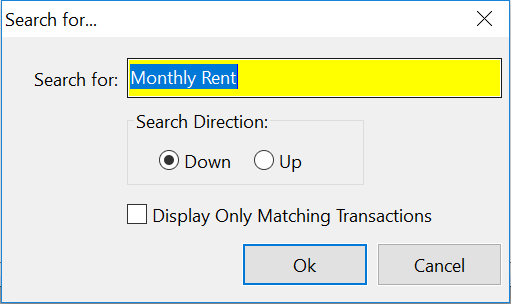 A similar option is provided for searching only the description field of the transactions that are listed. Right click on the transaction list and select Search Descriptions. A similar window will appear for you to enter a word or phrase to search for.