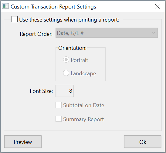 The options to print or preview the journal transactions will print a standard report in date and G/L # order. You can select the Custom Report Settings option on the popup menu to change how the report is generated. When you select this option, the following window will appear: