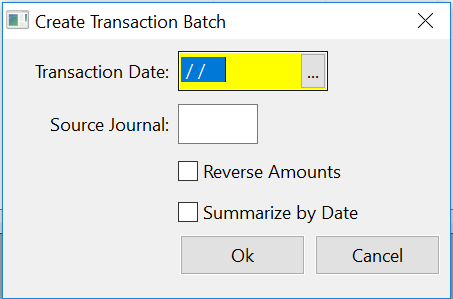 To do this, first use the selection criteria to narrow down the transactions that are displayed. Once you have only the transactions displayed that you want to base the new manual entries on, select the Create Transaction Batch option from the popup menu. The following window will open: