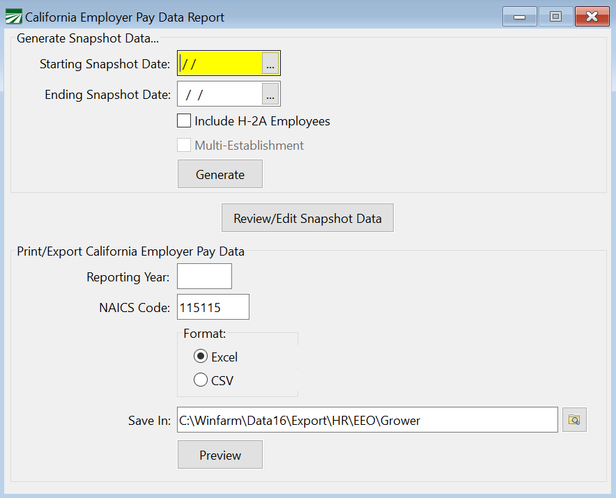 6. When you are ready to generate the final report/export file, go back to the Reports > California Employer Pay Data Report window.