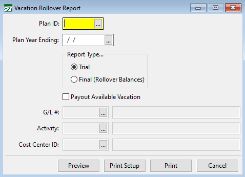 Enter the vacation Plan ID that you want to print the report for. Only employees assigned to that Plan ID will be printed. Leave this entry blank to print all employees that are assigned to any Plan ID.