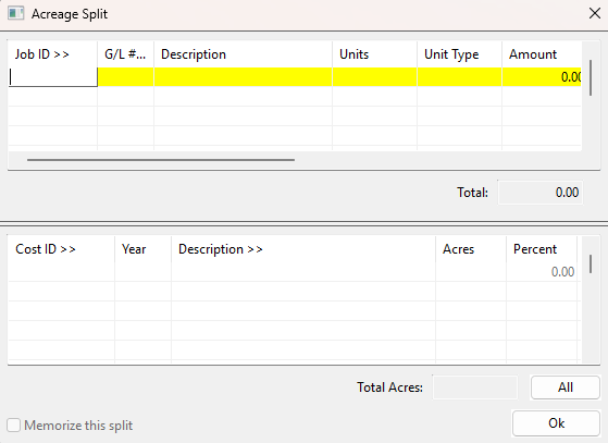 This feature allows you split miscellaneous charges amongst multiple cost centers. When you click Acreage Split, the following window will open: