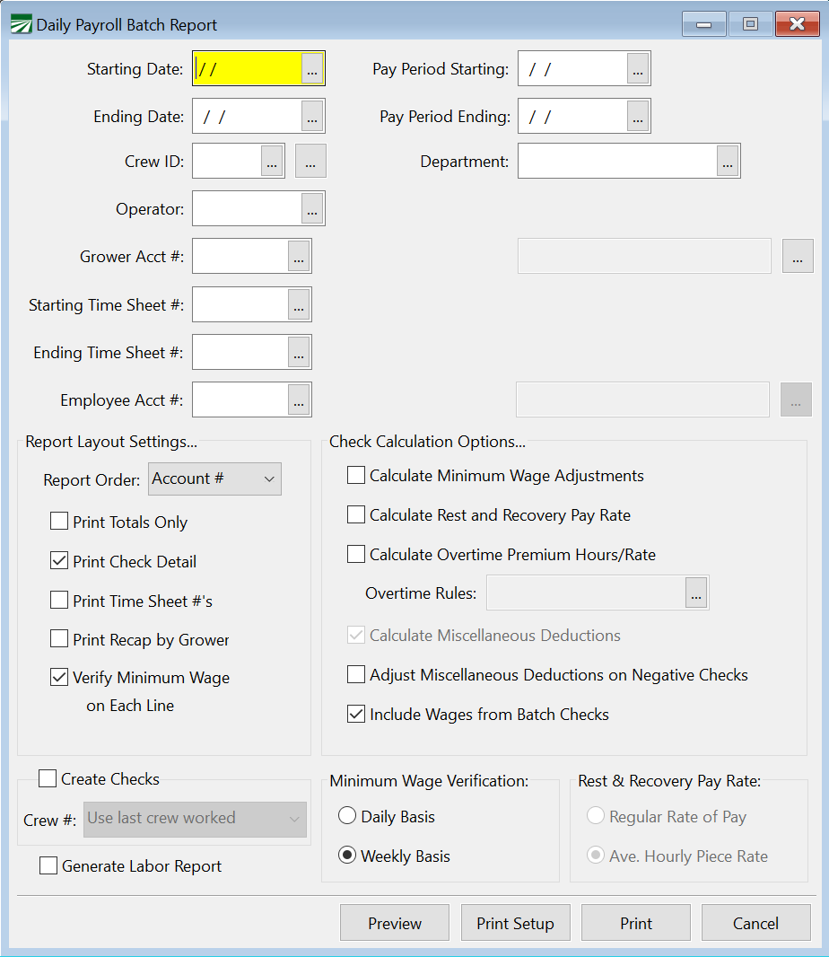 This can be used in place of the Generate Labor Report option that is available on the right click menu of the Daily Payroll Entry window. This way is faster and the batch report’s built in calculations for overtime premium, rest & recovery pay rate, and sick pay rates will all be factored into the entries created in the Grower Labor Report.