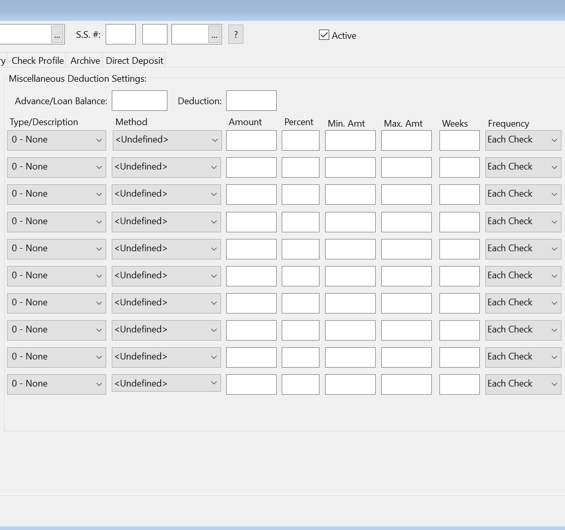 In this section, you can set up deductions for advances, loans, child support, withholding, health insurance, 125(c) and 401(k) plans, or any other non-tax deduction. The first two entries are used for advances/loans, and then ten entries are provided for user defined miscellaneous deductions.