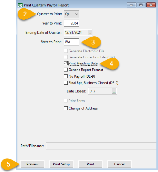 Select which quarter and enter the year that you want to print the report for. The ending date of the quarter will be displayed.