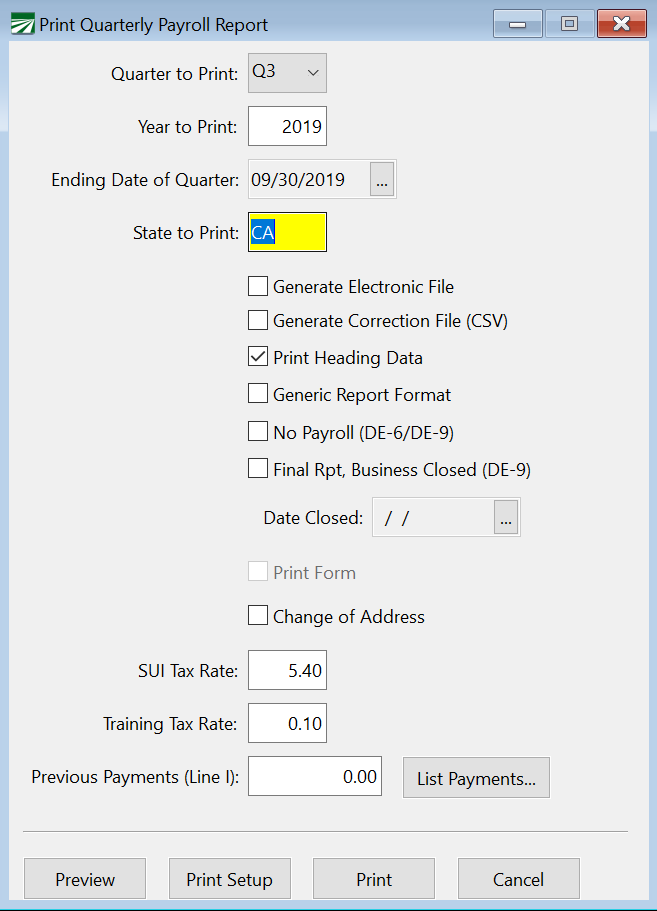 Enter the postal abbreviation of the state you want to print. If you have employees in different states, this will allow you to print different reports for each state.