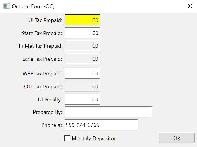 Enter the amount of taxes you have paid for the quarter by tax type and click Ok.