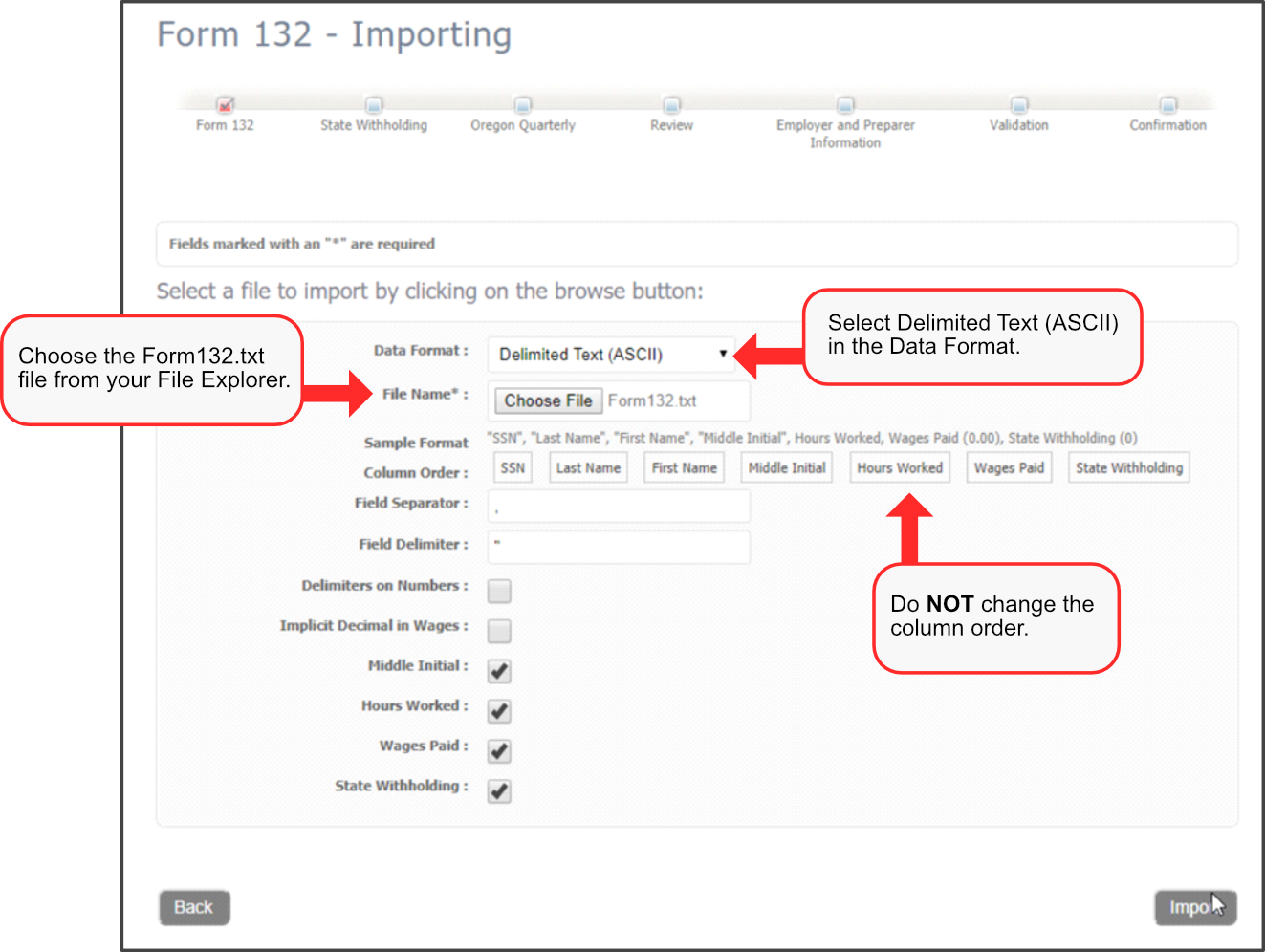 On the Form 132 – Import screen and Schedule B – Import screen, you will choose Delimited Text (ASCII) for the Data Format. Then you will choose the corresponding .txt file.