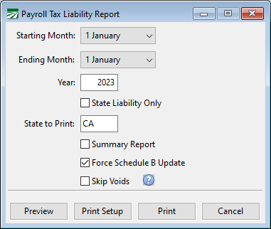 The Tax Liability Report provides detailed information on your Federal and State payroll tax liabilities. This is needed because the IRS, as well as the State of California, requires that you make periodic deposits of payroll taxes when the amounts reach a certain limit.