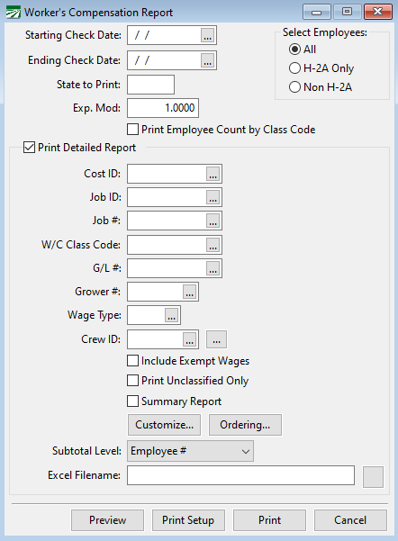 When printing a detailed Worker’s Comp Report, you have complete flexibility over the order that information is printed in. This can be very useful because you may want the detailed listed and subtotaled differently depending on the situation.