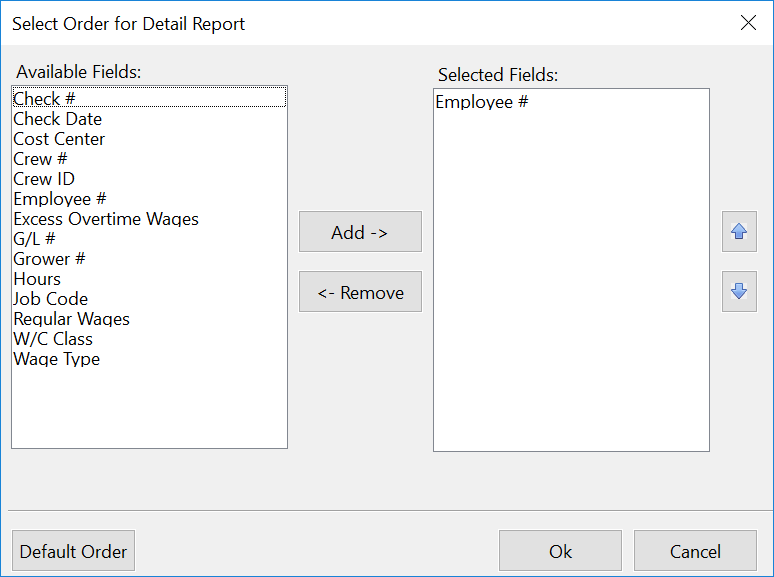 Example Your worker’s comp insurance company wants a detailed report that shows the total worker’s comp for each check that you have issued. So that you can get a total for each check, the Check # field must be the primary field. Highlight the Employee # field in the Selected Fields list and click on the Remove button. This will move the Check # up to the first item on the list.