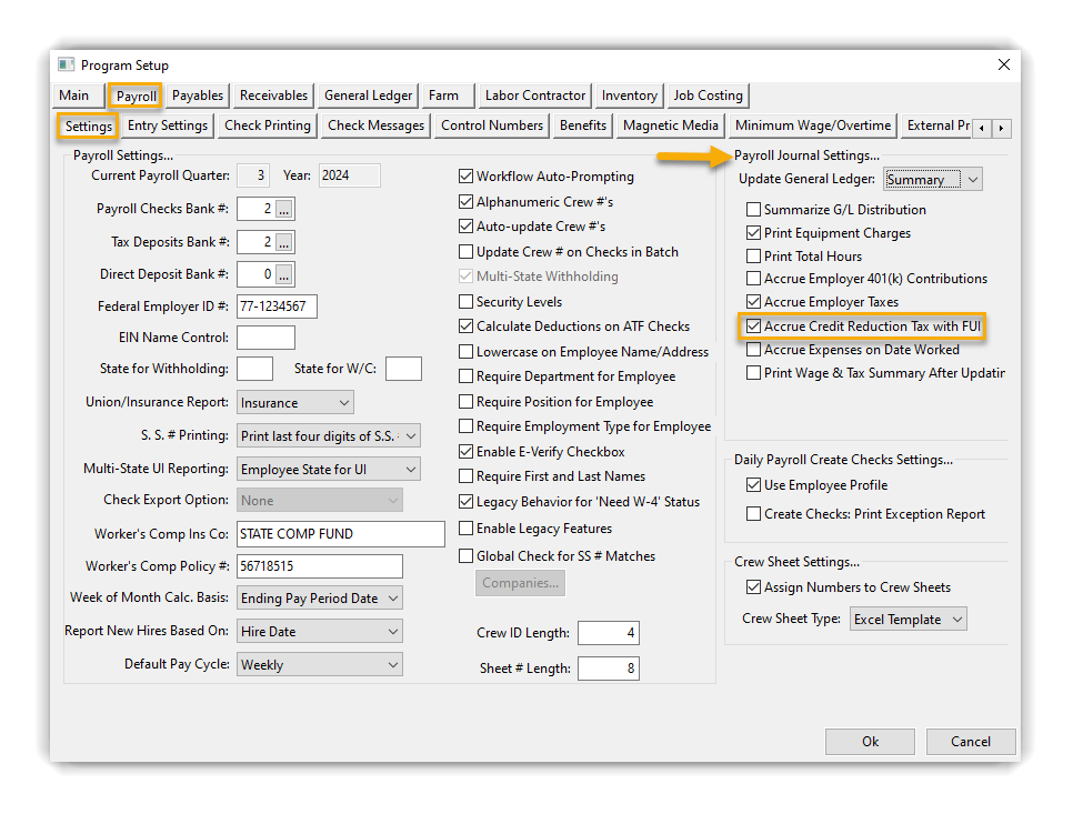 Under Payroll Journal Settings, select Accrue Credit Reduction Tax with FUI if you would like the additional tax included with the accrual.