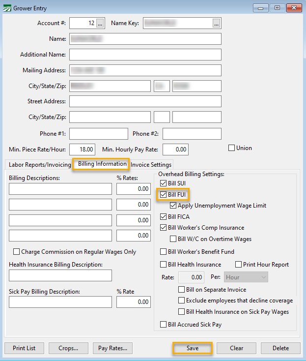 Click Save. Continue to do this for any other grower accounts you would like to bill for FUI.
