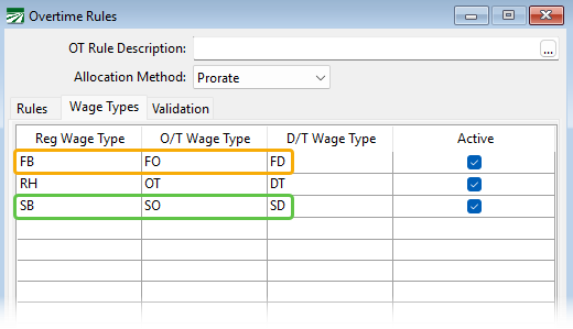 Wage types for bonuses and the overtime premium due (if needed) for a bonus need to be defined within the program. This is done under the Wage Types tab of the Overtime Rules Window (Payroll > Setup > Overtime Rules).