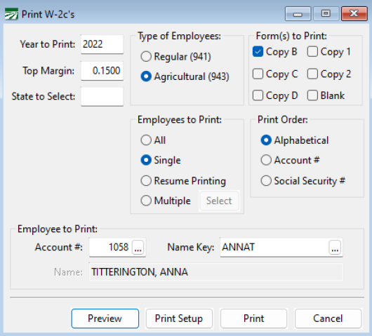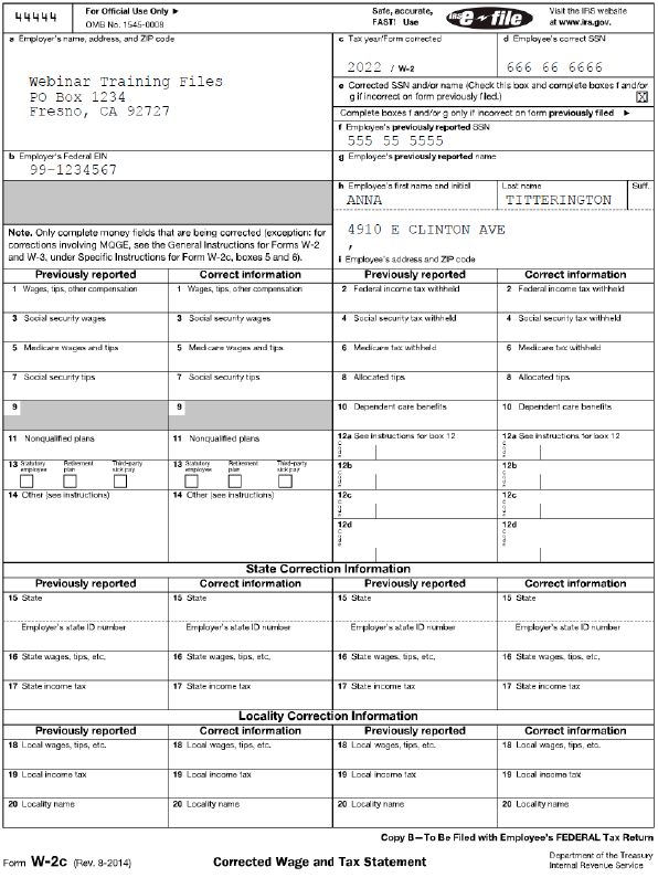 When you generate W-2’s the software records the current information printed on the W2’s. If you need to make a correction to a W2 AFTER printing the original: