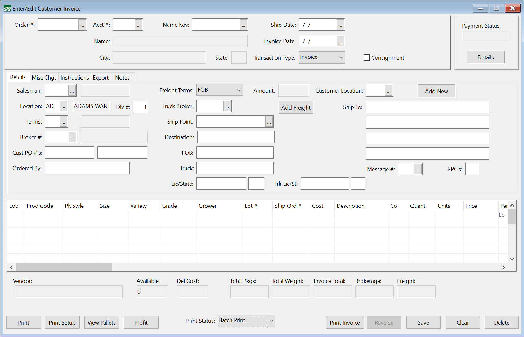 This window is also used to enter new invoices, credit memos, and returns. If you are using The Broker’s Office without the Inventory option, this window is where you will enter all new invoices.