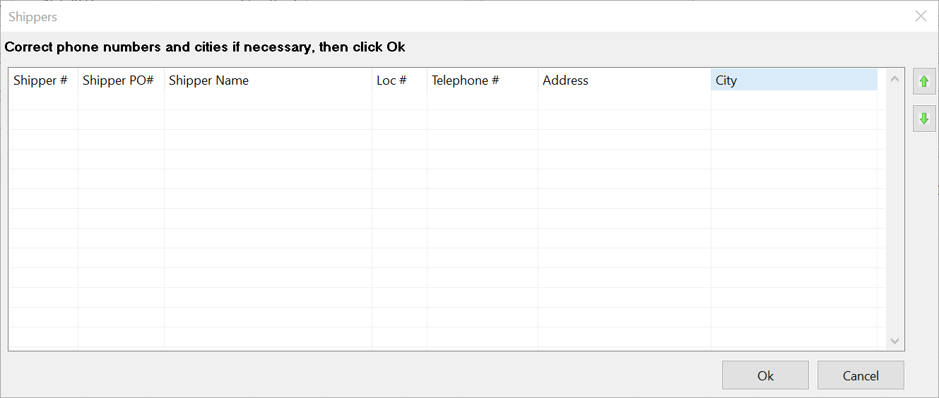You can make corrections to the telephone number and city on this window before printing the Load Sheet. If you have a specific route or pickup order that you want the trucker to use, the buttons on the right can be used to reorder the shippers in the list by moving the currently selected line up or down. You can also hold down the Alt key while pressing the up or down arrow keys to move the current line up or down. The Load Sheet will print the shippers in the same order that they are shown on the screen.