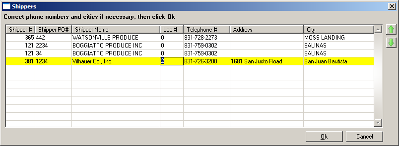 In addition, before the Load Sheet is printed, the program will display a dialog that lists the shippers and allows you to edit the telephone numbers and city for each combination of shipper/order number. This is done so that if you are buying produce from shippers who have multiple warehouses in different cities, you can specify which location the product needs to be picked up from. The information you enter on this dialog will be printed on the Load Sheet.