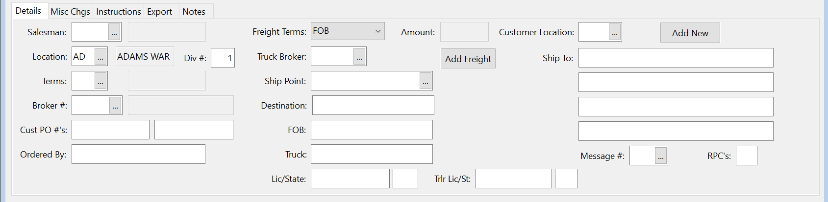 If there is a broker for this order, enter the broker’s account number here (broker accounts are set up in the accounts payable vendor file). The program will allow you to enter an amount for brokerage (per package) on each line item.