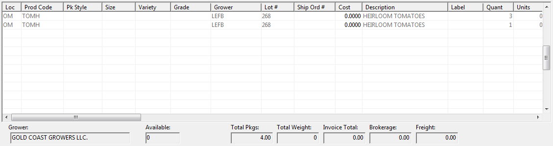When entering line items, you can check inventory balances by using the inventory lookups and select the product code and/or grower and/or lot number from the inventory lookup.