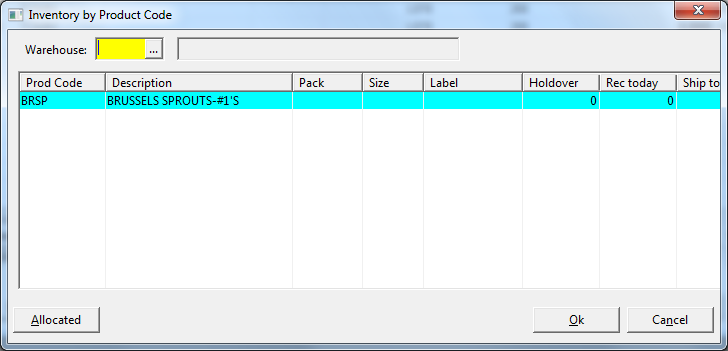 To access the master inventory balance lookup (totals by product code) press [F11]. This lookup will show the quantities in transit, allocated (ordered but not shipped yet), balance on hand and balance available to sell for each product code (and pack style and size, if applicable).