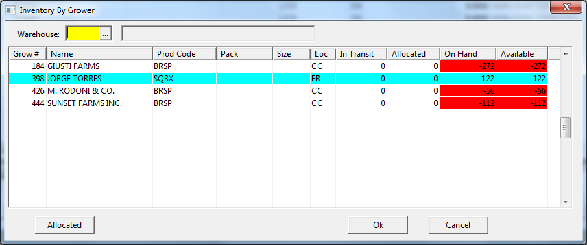 To view inventory balances by product code and grower, press [F12]. This lookup displays the amount available for each grower and product code.