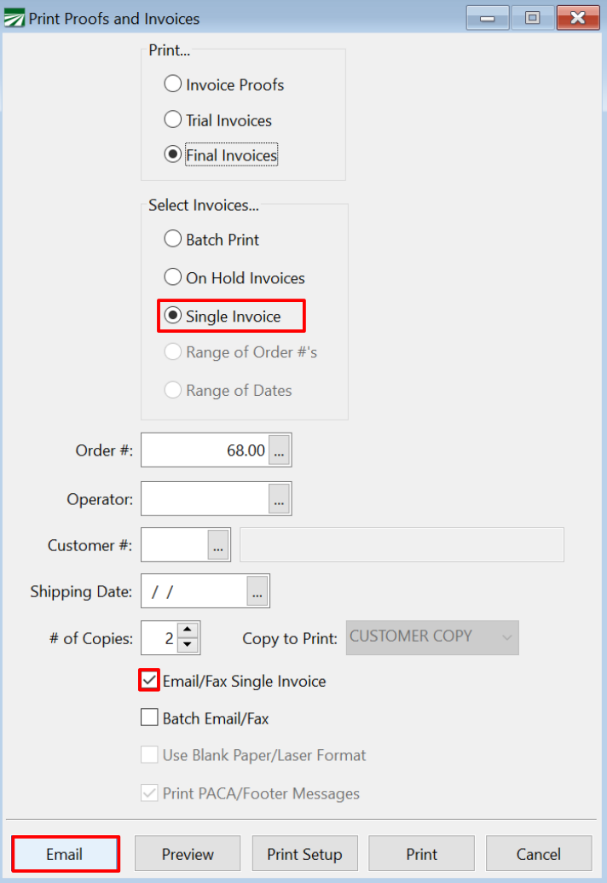 On the Print Proofs and Invoices window, select the Email/Fax Single Invoice box.