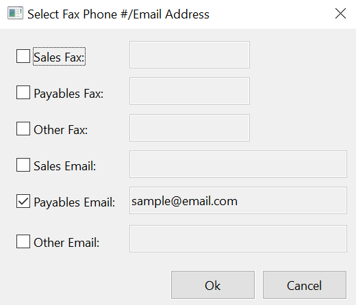 Click Email and the following window will open. You can select from the various fax numbers and email address for this customer. There is also an option to select Other Email and enter an additional email. Then click Ok.