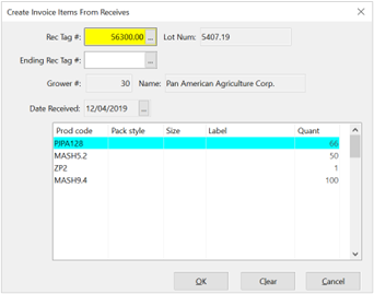 4. Once you have chosen the receive, the bottom grid will list all the items in that receive. If this is correct, click Ok. The program then adds all those items to the invoice automatically.