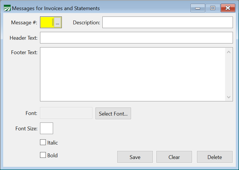 The message file is used to set up messages that will print on customer invoices, statements and certain reports.