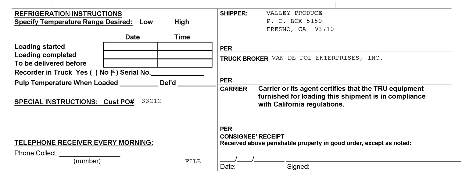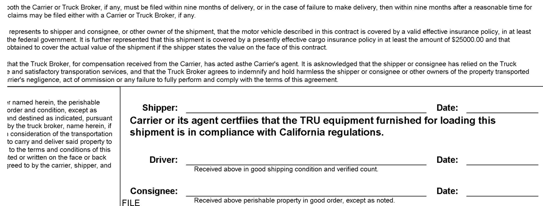 Tip The 2013 CA Air Resources Board (CARB) regulation requires the party that arranges the transport of perishable goods to only hire and load carriers that have compliant transport refrigeration units (TRU's). When determining the responsible party in the event of a violation, CARB looks to see whether a shipper has exercised due diligence in determining whether or not a carrier was compliant at the time of loading. The Western Growers Association has suggested this message be added to your bill of lading: