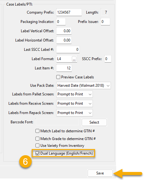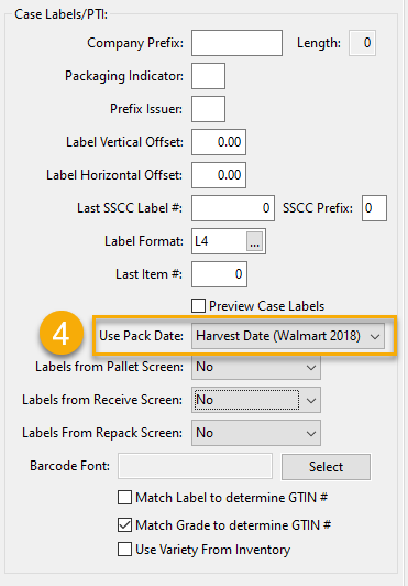 The Pack Date or Harvest Date label is also pre-programmed. You can select either label by going to Tools > Shipper Setup > Packouts/Bulk Inventory/Case Labeling tab. Then make a selection in the Use Pack Date entry under the Case Label/PTI section.