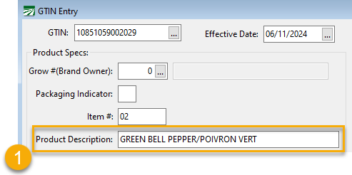 In the GTIN entry window (Case Labeling > GTIN Entry), edit each Product Description to provide an English/French description of the product. The 4” wide label will allow a description of up to 32 characters, so it may be necessary to abbreviate it.
