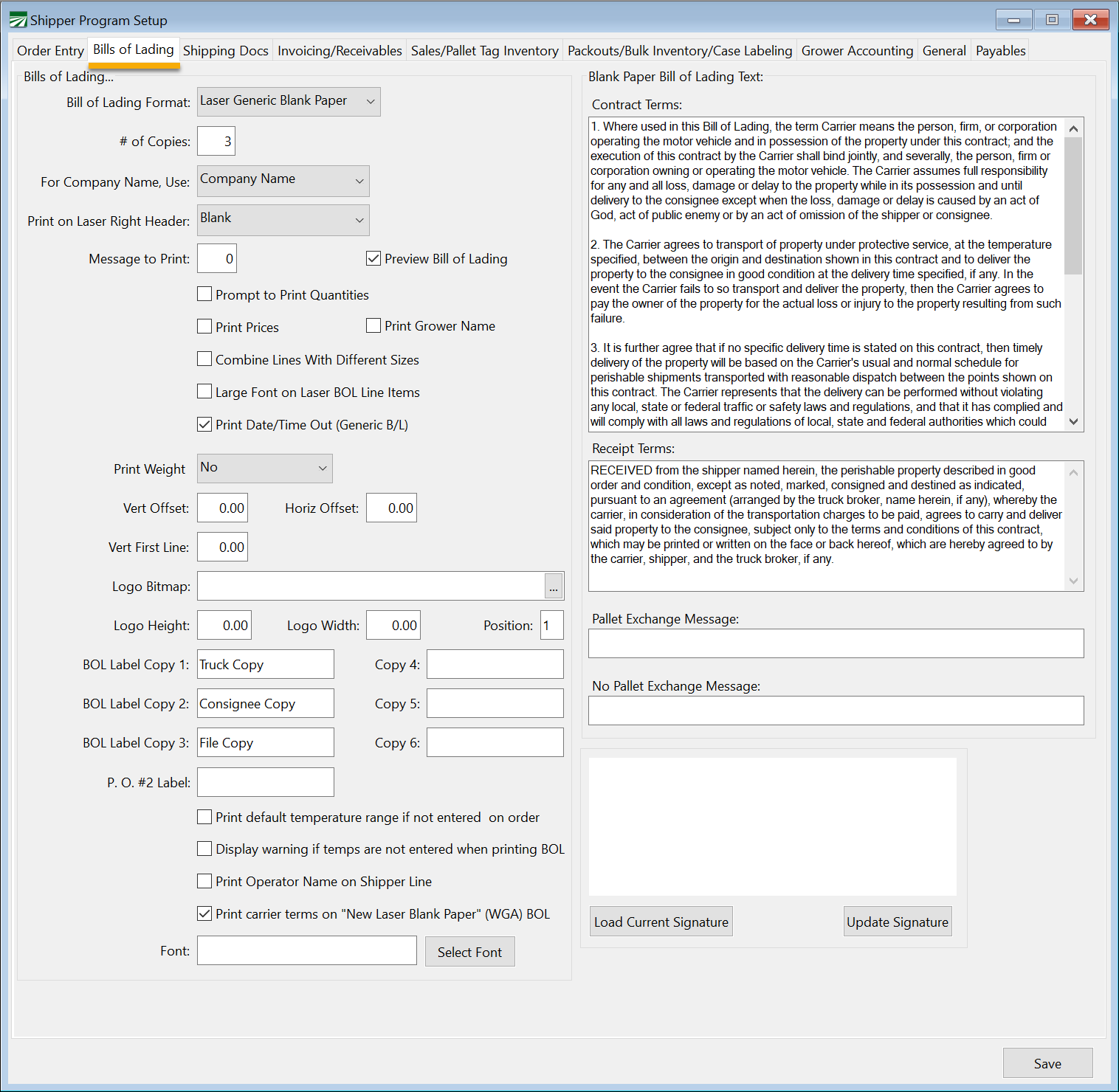 There are several format options to choose from. This setting will determine which bill of lading format the program will use when you print from the invoice.