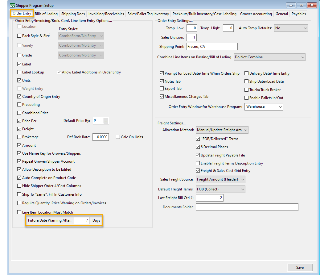 Here you can set the number of days in the future to trigger the Future Date Warning. You may want to adjust this setting if you regularly enter orders two weeks or more in advance.