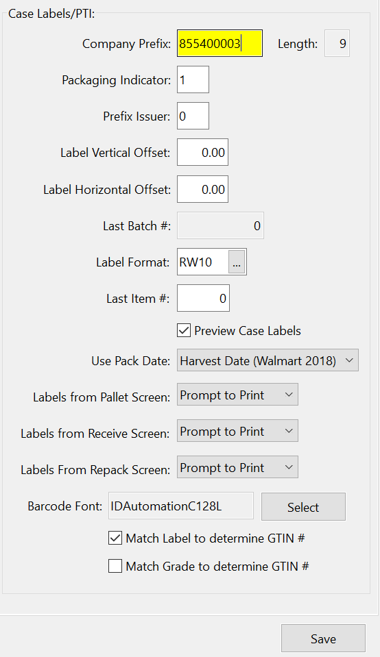 Initial setup includes defining your Company Prefix, the type of label you will use, and whether or not you will print the date as a part of your case label identification.