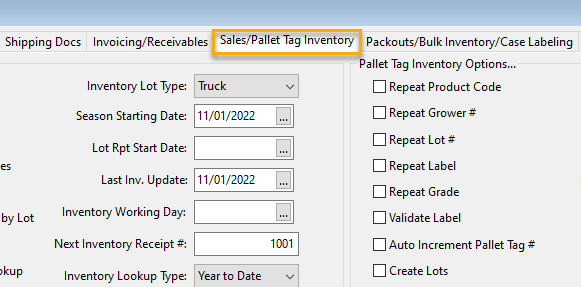 Check this box if you will be mixing product from different lots from one or more growers on the same pallet tag number. When you enter a pallet tag with a quantity less than the default number of packages per pallet, the program will ask if you want to enter another grower or lot for this tag.