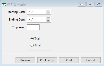 If you have transactions dated after your starting date for converting to the WIP method posted to expense accounts, these transactions should be moved from the various expense accounts to the appropriate Crops in Ground account. A WIP Conversion report has been created to do this. This report can be run in trial or final mode. In trial mode, you can make sure that all of the transactions for WIP cost centers have a matching Job ID. In final mode, it will actually change the Job ID and general ledger account for the transactions listed.