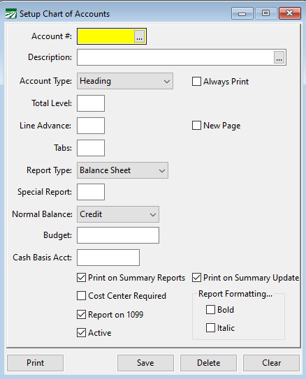 If you have open vendor invoices and customer invoices, these accruals will automatically be reversed based on the report dates and the payment status as of that report date. For WIP accruals however, the program does not currently have a way of backing the accrued expenses off of your Crops in Ground account to the various expense accounts where they would normally have been posted on a cash basis. Currently you must enter a Cash Basis G/L account number for your Crops In Ground account. This should be an expense account where the financial reports will transfer the current Crops in Ground balance when reporting on a cash basis.